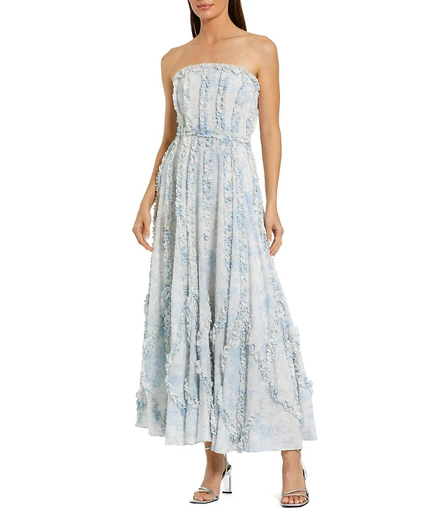 Mac Duggal Floral Print Mesh Crew Neck Sleeveless Tier Ruffle Sheath Gown