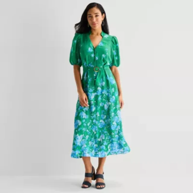 Melonie T Womens Plus Belted Short Sleeve Midi Shirt Dress