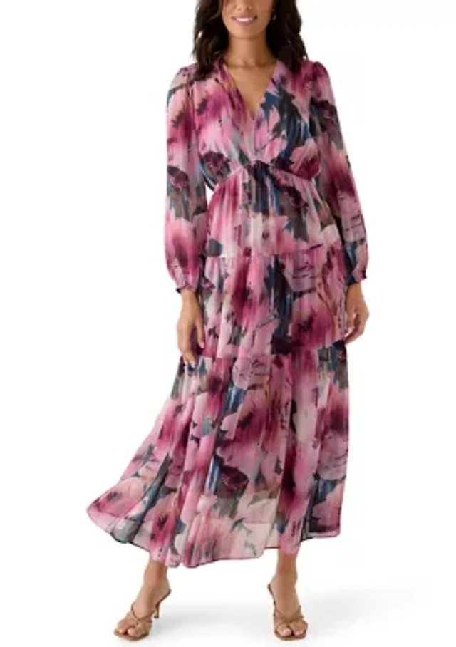 Forever Beauty Puff Sleeve Floral Chiffon Midi Dress