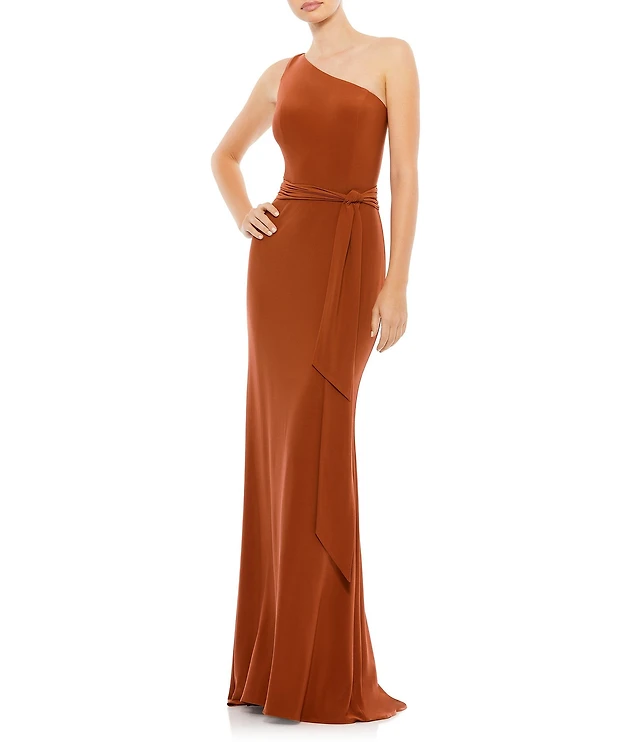 Mac Duggal One Shoulder Belted Jersey Trumpet Gown