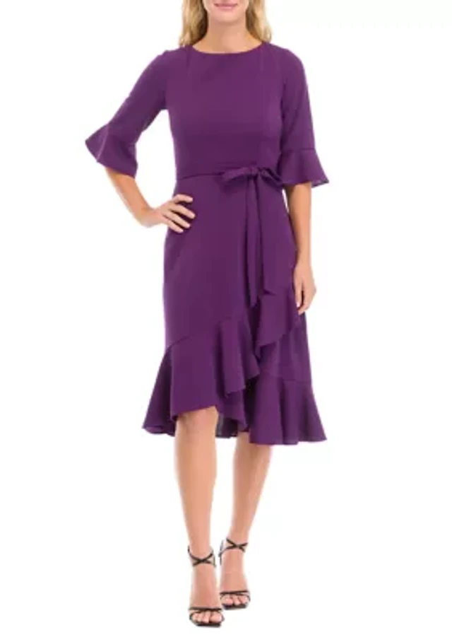 Women's Bell Sleeve Ruffle Crepe Fit and Flare Dress
