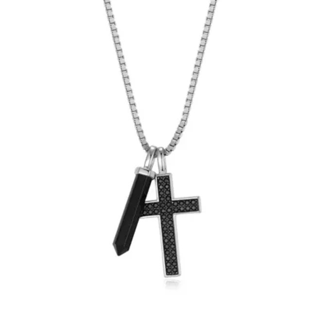 Marquise and Round Black Spinel Gothic-Style Cross Pendant in Sterling Silver and Black Rhodium Plate - 24"