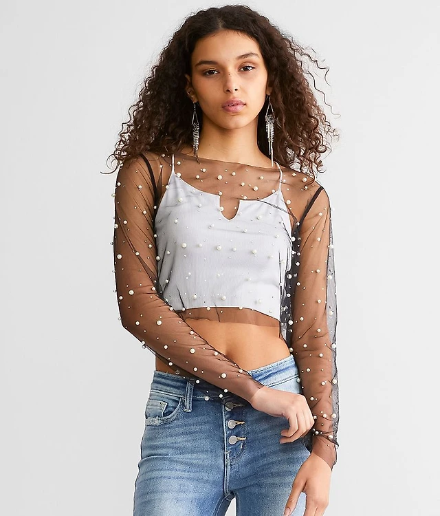 endless rose Women's Gridded Mesh Feathered Cropped Top