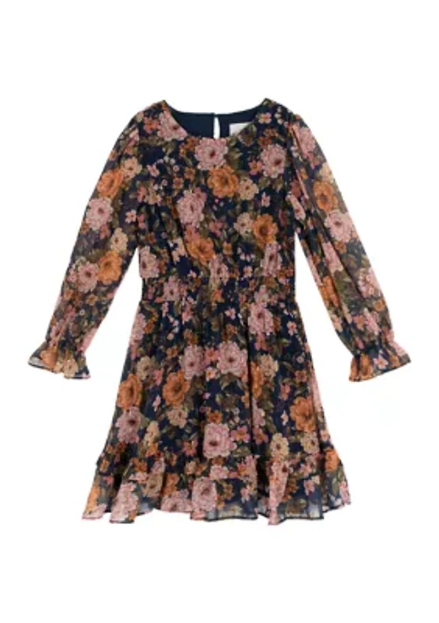 Girls 7-16 Blouson Sleeve Dark Floral Chiffon Dress