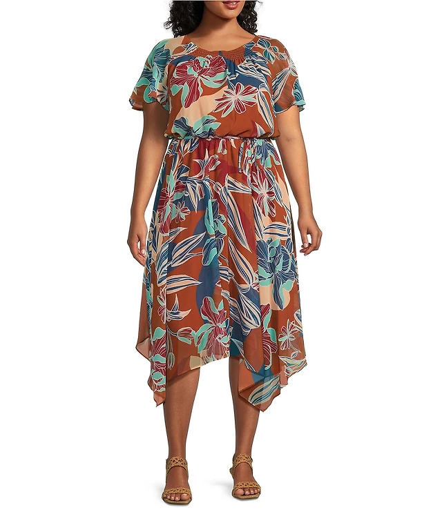 Plus Short Blouson Sleeve Printed Shirt Dress