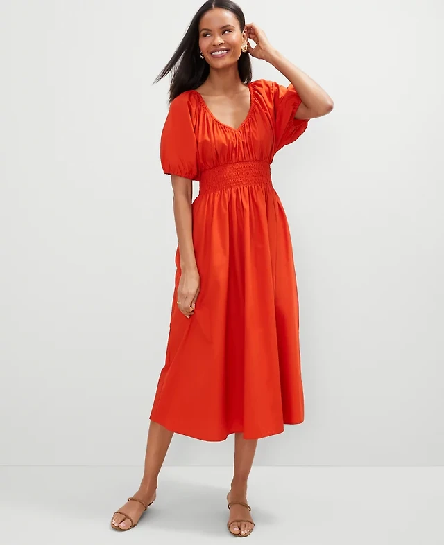Ann Taylor Petite Smocked Puff Sleeve Midi Dress Red Pepper Women's