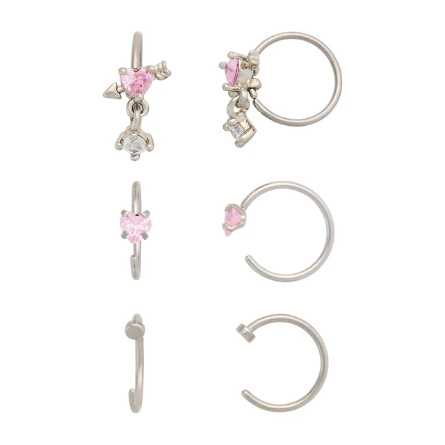 Multi-Pack Pink CZ Heart Dangle Nose Hoops 6 Pack - 20 Gauge