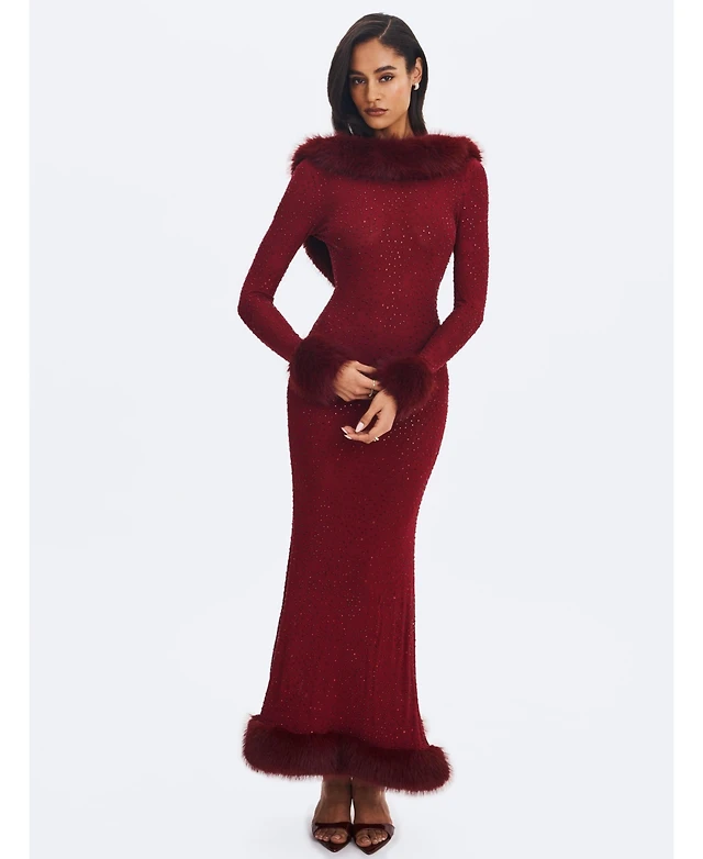 Miss Circle Women Mellie Burgundy Regular-Length Rhinestone Mesh Low Back Mermaid Gown