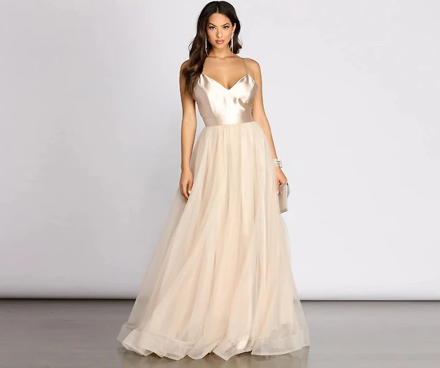 Emily Satin V Neck Tulle Ball Gown