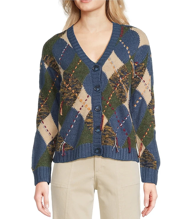 Tru Luxe Jeans Argyle Crew Neck Long Sleeve Button Front Cardigan