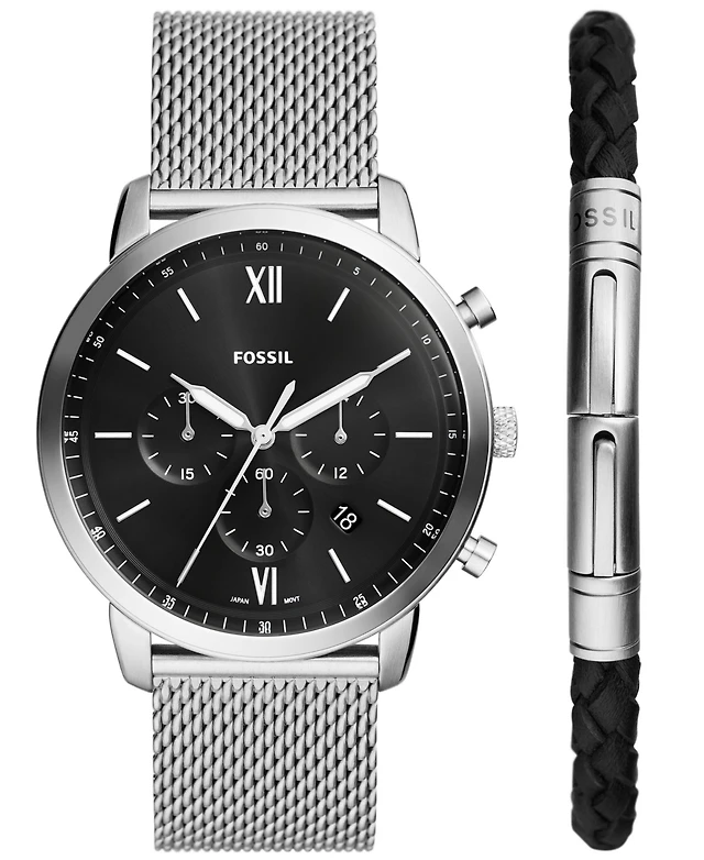 Fossil Men's Neutra Chronograph Silver-Tone Stainless Steel Mesh Watch 44mm and Bracelet Box Gift Set