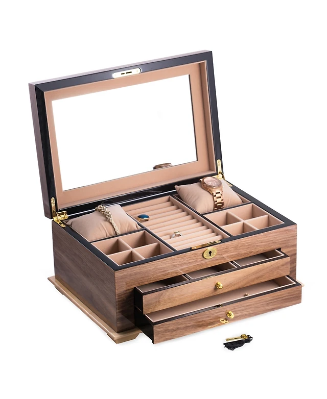 Bey-Berk Walnut 3 Level Jewelry Box with Gold tone Accents and Locking Lid