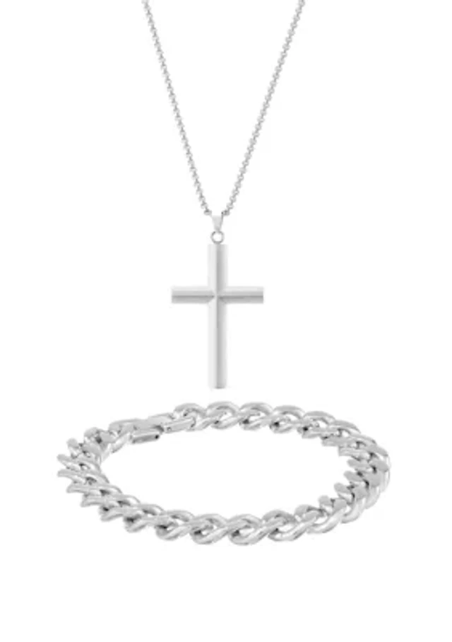 Stainless Steel Cross Pendant and 11 Millimeter Curb Chain Bracelet with Gold Tone Ion Plating in a Box Set