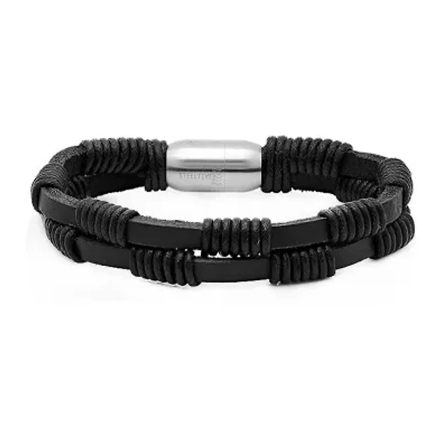 Steeltime Men's Genuine Black Leather Bracelet with Stainless Steel Magnetic Clasp