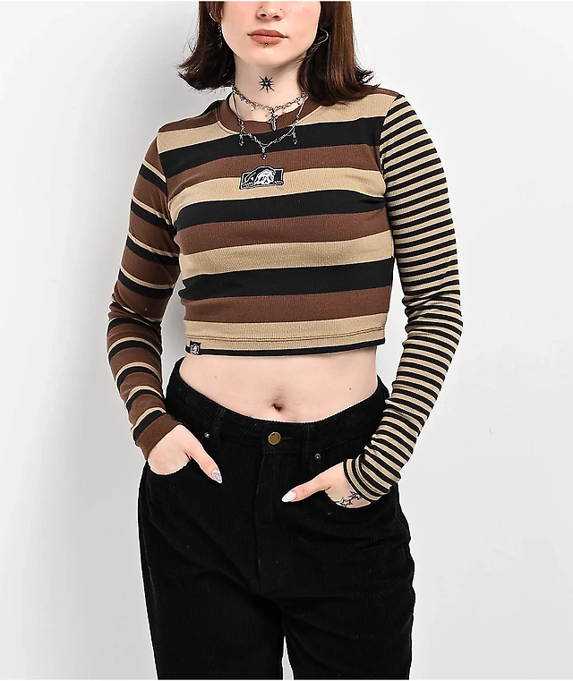Lurking Class by Sketchy Tank Striped Brown Long Sleeve Crop T-Shirt
