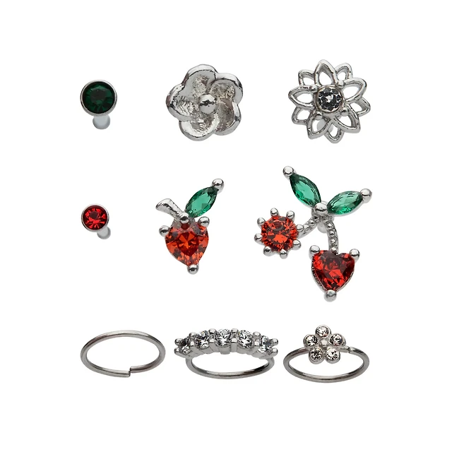 Multi-Pack CZ Bow Nose Pin and Hoop Rings 9 Pack - 20 Gauge