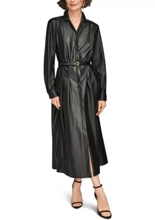 T Tahari Women's Faux-Leather Belted Button-Front Dress
