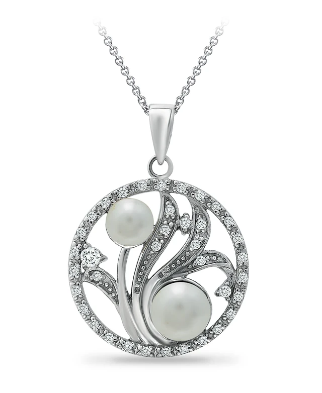 6mm Multi White Imitation Pearls and Cubic Zirconia Floral Medallion Pendant on 18" Chain, Crafted in Silver Plate