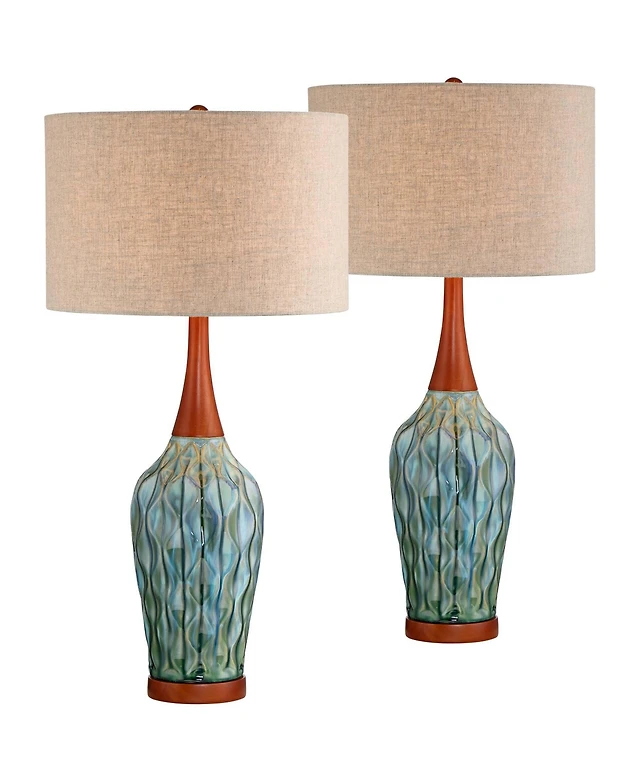 360 Lighting Modern Accent Table Lamps 14 3/4" High Set of 2 Diamond Blue Green Glass Fabric Drum Shade for Bedroom Bedside Office (Color May Var