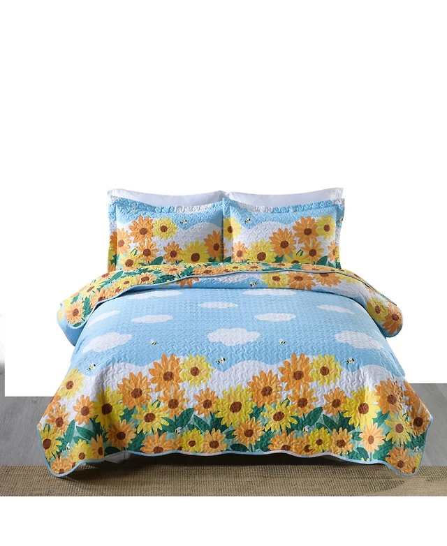 MarCielo 3 Pcs Printed Floral Lightweight Quilt Bedspread Set Queen