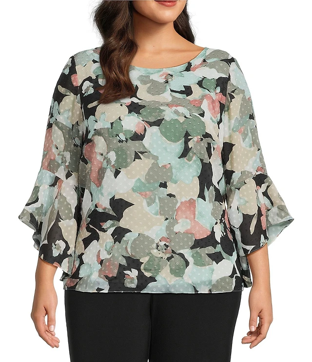 Kasper Plus Size Boat Neck 3/4 Ruffle Sleeve Chiffon Printed Blouse