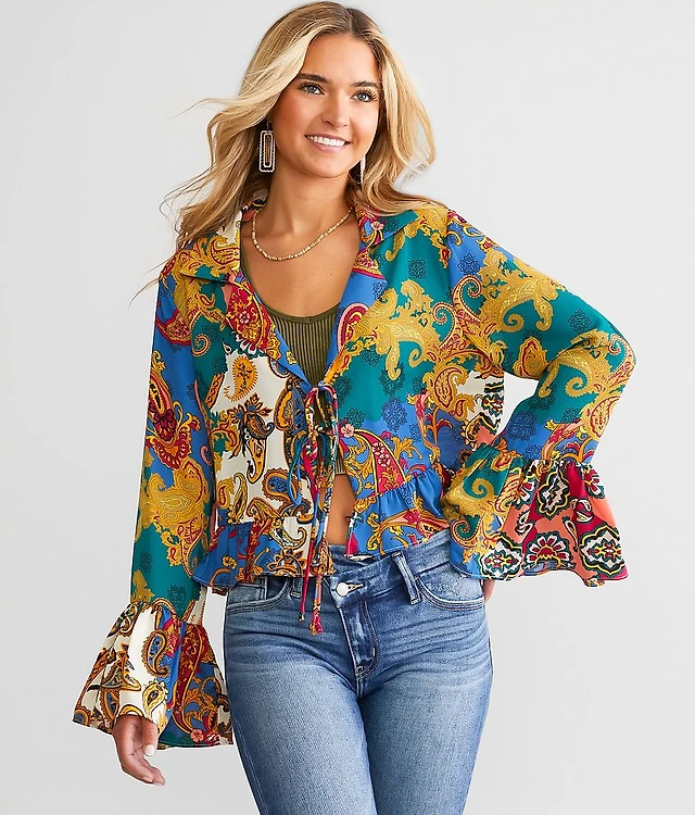 Retro Babe Chiffon Paisley Print Tie-Front Blouse