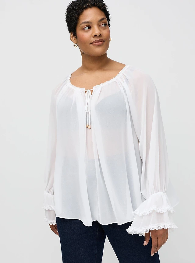 Cotton Lace Tie Front V-Neck Blouse