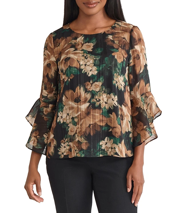 Liverpool Los Angeles Chiffon Floral Print V-Neck Long Sleeve Pleated Top