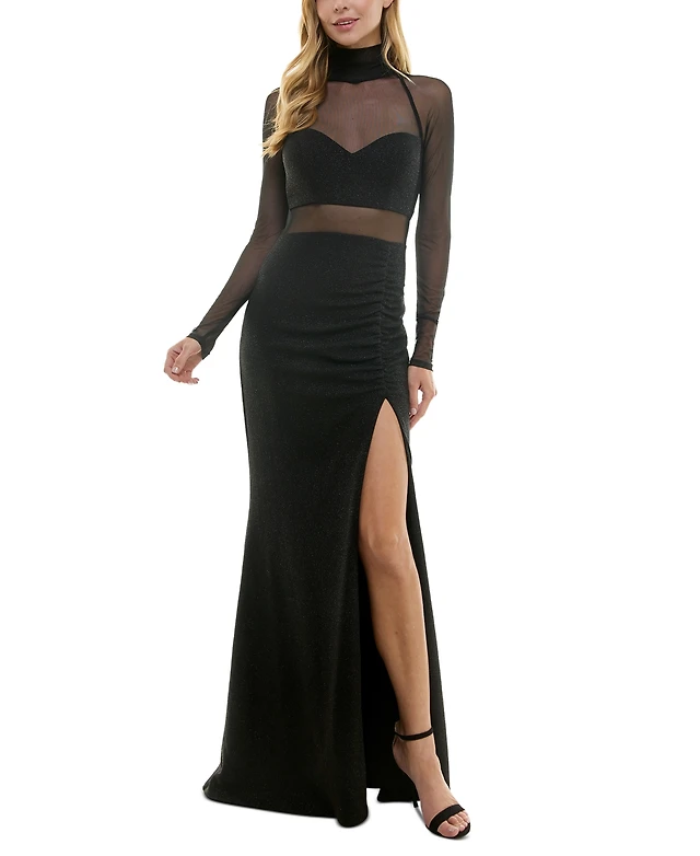 City Studios Juniors' Shirred Split Neck Ruched Bodice Slit Gown