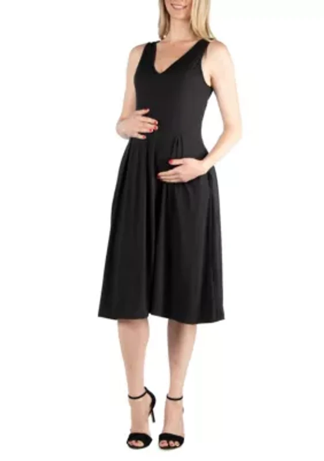 Fit and Flare Sleeveless Maternity Midi Dress with Pockets