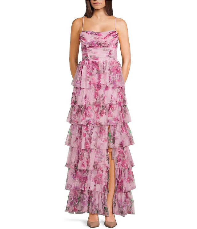 City Vibe Floral Printed Mesh Scoop Neck Side Slit Tiered Ruffle Ball Gown