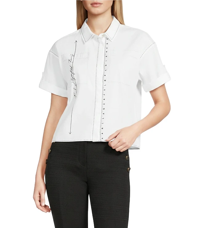 KARL LAGERFELD PARIS Poplin Point Collar Short Sleeve Floral Trim Top
