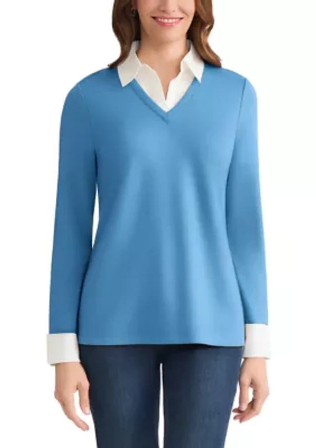 Ann Taylor Petite Weekend Layered Mix Media Top Cashmere Blue Women's