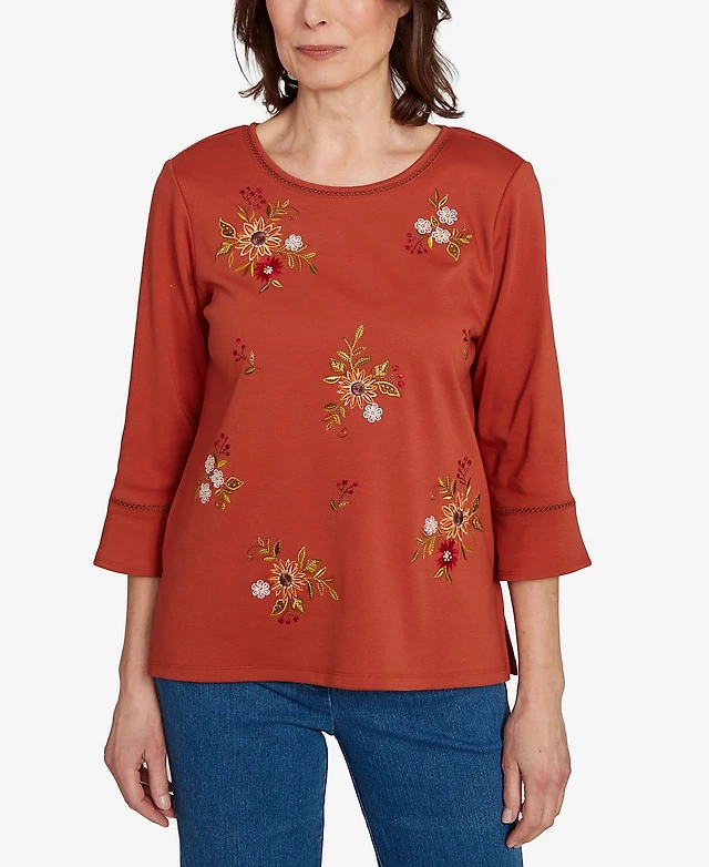 Alfred Dunner Women's Classic Floral Border Embroidered Split Neck Top