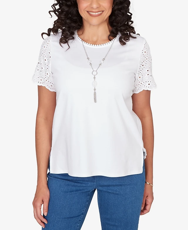 Alfred Dunner Petite Classic Solid Eyelet Sleeve Top with Necklace