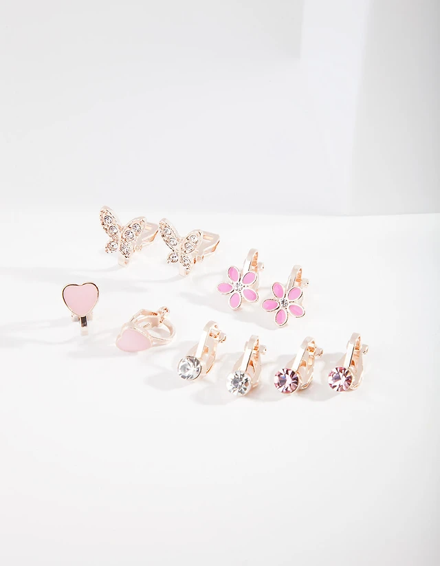 Kids Rose Gold Diamante Star Butterfly Heart & Bow Clip On Earring 5-Pack