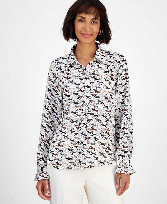 Le' AL.X Horse Print Satin Notch Lapel Short Sleeve Cropped Coordinating Camp Shirt