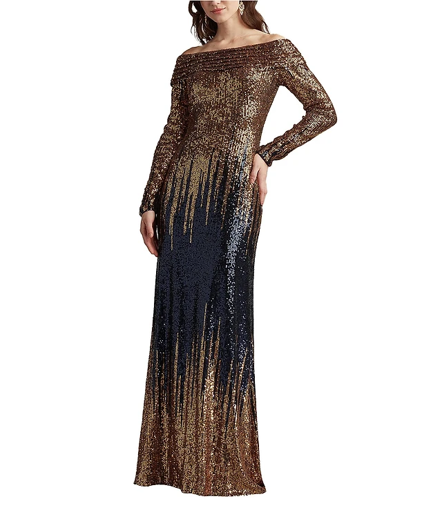 Tadashi Shoji Long Sleeve Off The Shoulder Ombre Sequin Dress
