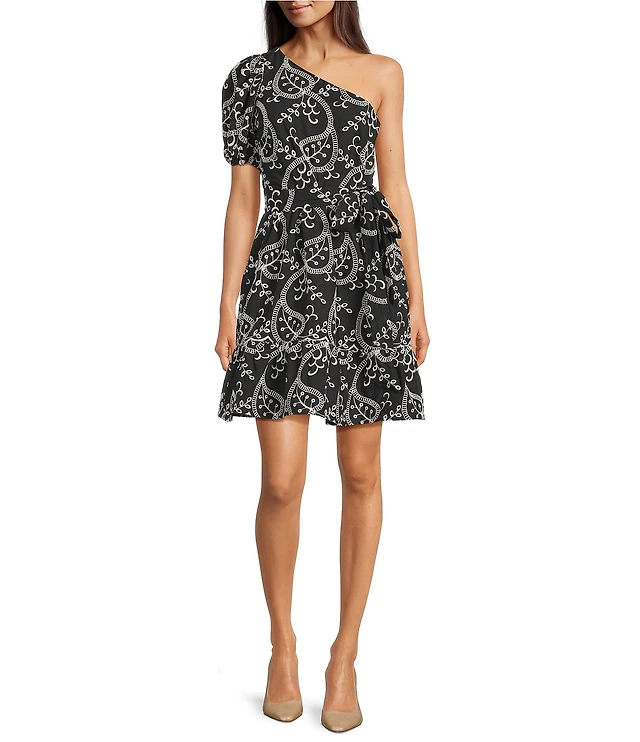 Anne Klein Voile One Shoulder Puff Sleeve Short dress