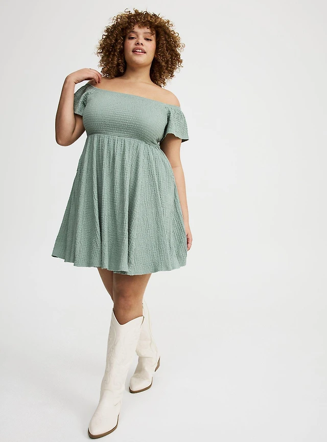 Midnight Doll Floral Print Off The Shoulder Smocked Bodice Puff Sleeve Tiered A-Line Dress