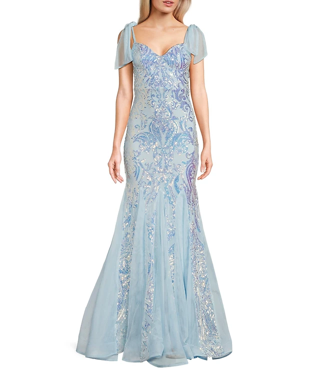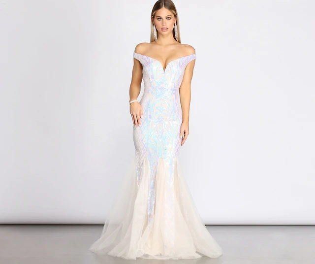 Andrina Iridescent Sequin & Tulle Off Shoulder Mermaid Dress