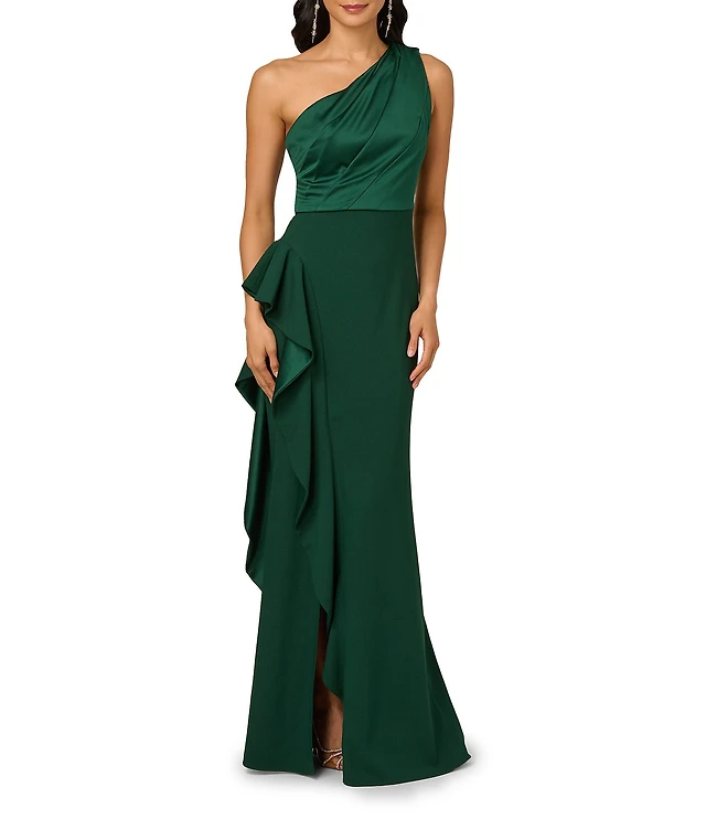 Betsy & Adam Satin Bow One Shoulder Scuba Crepe Sleeveless Mermaid Gown