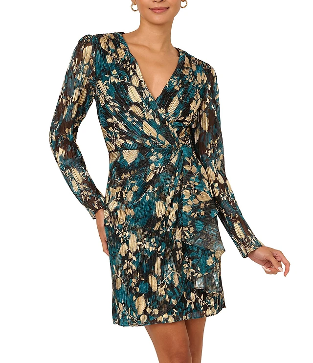 R & M Richards Festival Crinkle V-Neck 3/4 Balloon Sleeve Metallic Wrap Midi Dress