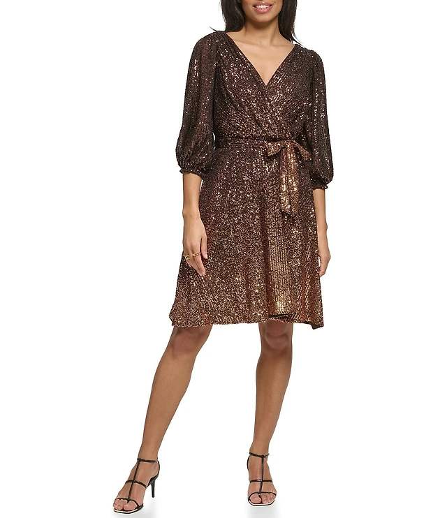 DKNY by Donna Karan Surplice V-Neck Long Balloon Sleeve Asymmetrical Hem Faux Wrap Dress