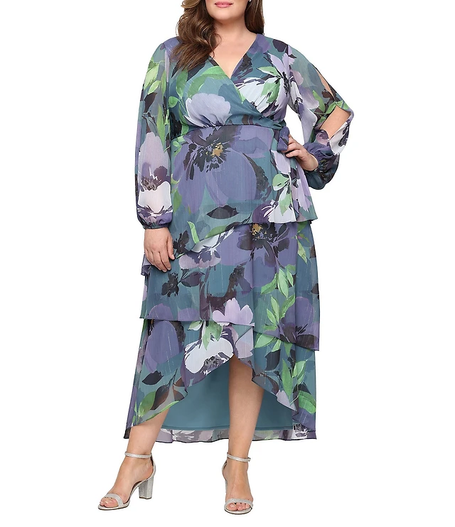 Ignite Evenings Plus Size Chiffon V-Neck Long Split Sleeve Faux Wrap Floral Print High-Low Hem Tiered Maxi Dress