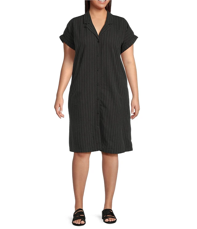 Kensie Stripe Cotton Point Collar V-Neck Cap Dolman Sleeve Smocked Pleated Midi A-Line Dress