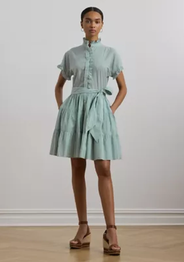 Lauren Ralph Lauren Silky Cotton-Blend Point Collar Long Roll-Tab Sleeve Button-Front Belted Shirt Dress