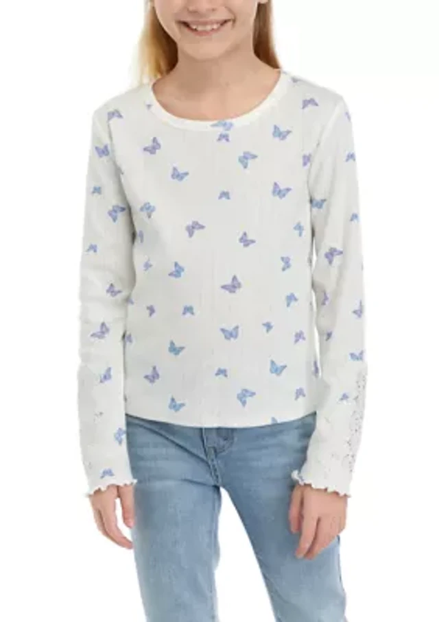 Girls 7-16 Long Sleeve Crew Neck Crochet Lace Top