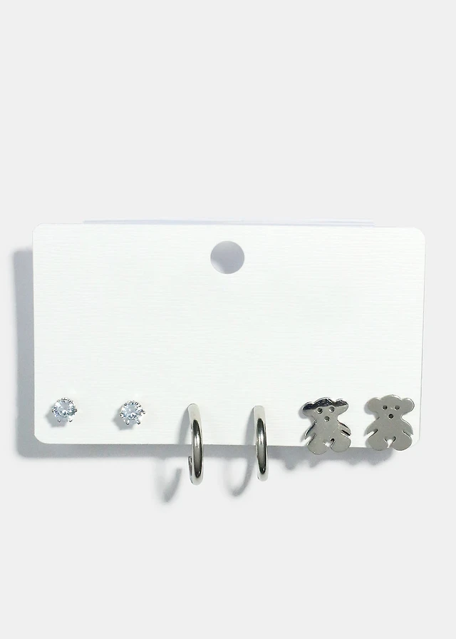 3-Pair Teddy Bear Stud & Hoop Earrings