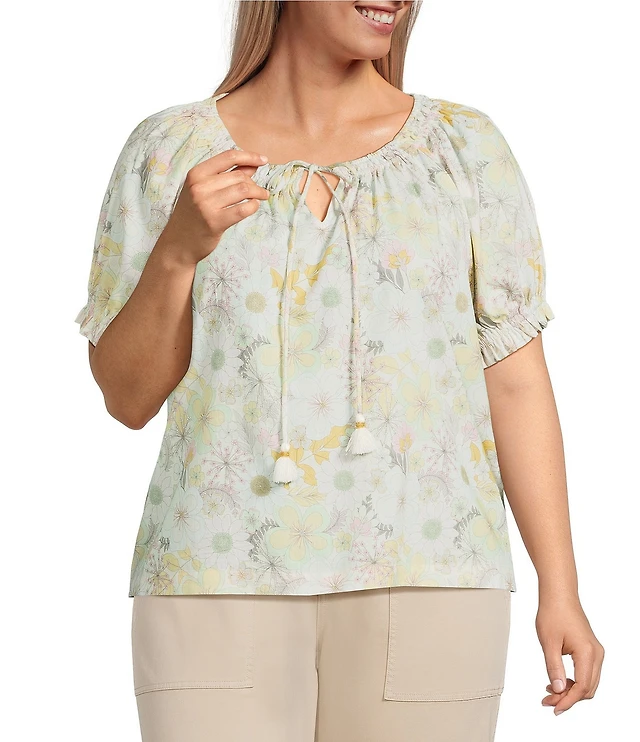 Multiples Petite Size Monochrome Floral Scoop Neck 3/4 Sleeve Layered Hem Top